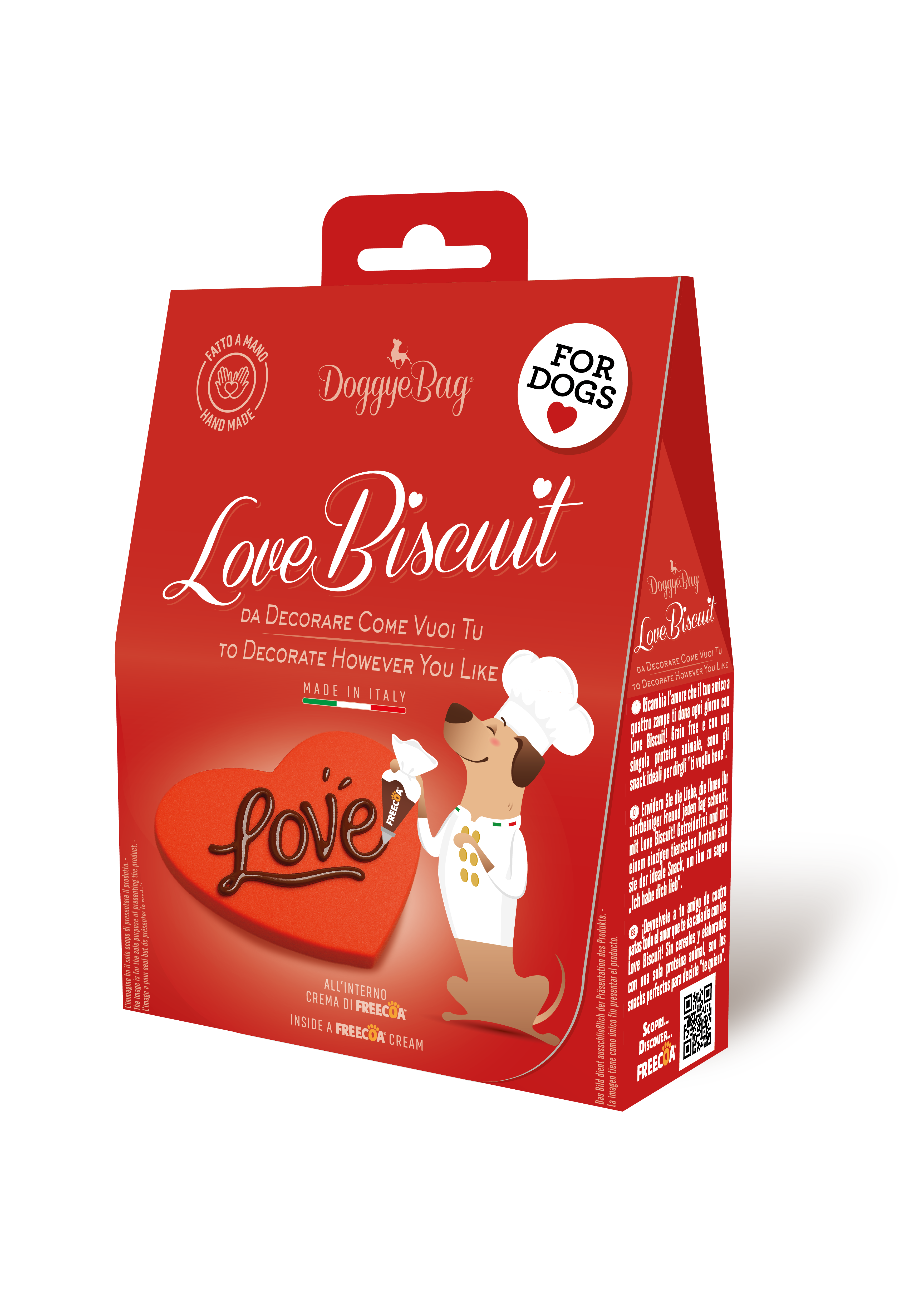La Love Collection comprende tre referenze: Gli Amorosi, Love Biscuit e Love Bone. Si tratta di snack dolci per cani realizzati nel laboratorio di pasticceria artigianale DoggyeBag, a Brescia, con ingredienti di alta qualità originariamente destinati al consumo umano. Il posizionamento è chiaro: prodotto artigianale, 100% Made in Italy, con forte attenzione sia alla ricetta sia al confezionamento.