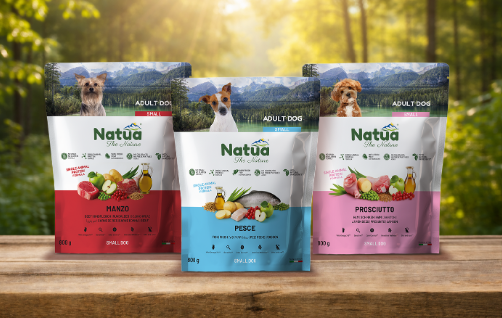 La gamma Natua Dry Line Small Dog è formulata con un’unica fonte di proteina animale per referenza, disponibile nelle varianti manzo, prosciutto e pesce. La scelta monoproteica punta a semplificare la composizione e a intercettare anche la domanda di alimenti adatti a cani con sensibilità alimentari o inseriti in diete di esclusione, previo parere del medico veterinario.