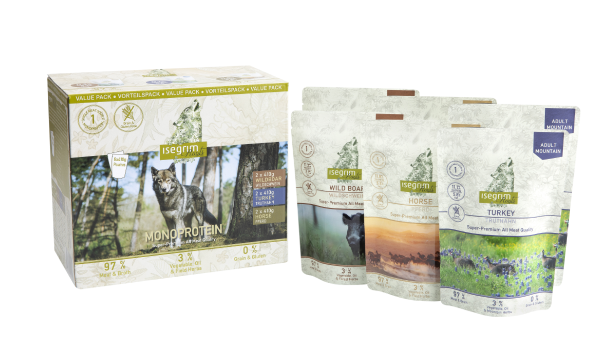 La linea Isegrim propone alimenti umidi e completi di qualità superpremium, caratterizzati da un elevato contenuto di carne fresca di alta qualità, combinata con ingredienti genuini e naturali ed erbe selvatiche. Le ricette si ispirano alla dieta ancestrale del lupo.