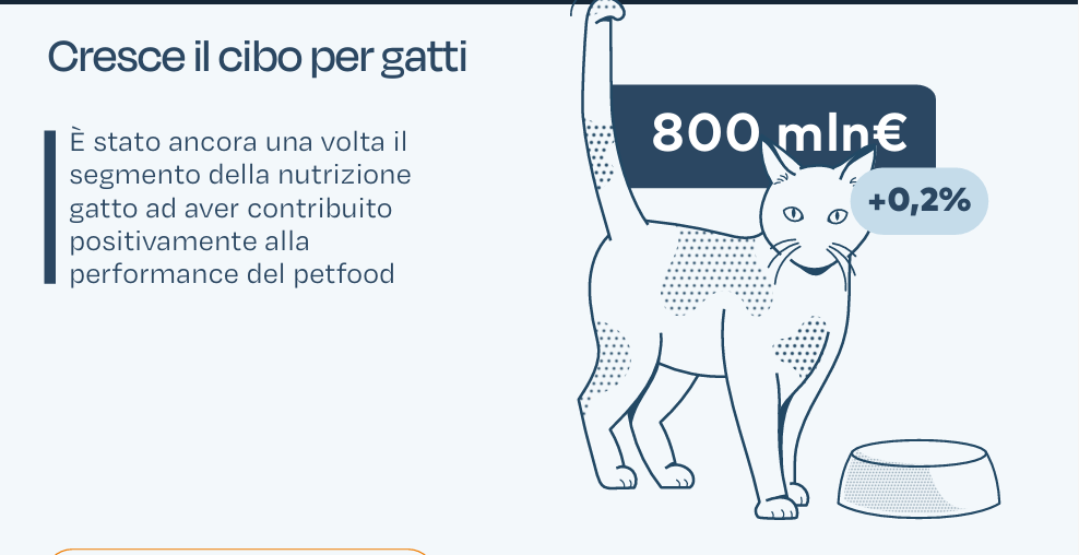 In totale il cibo per gatti ha sviluppato un fatturato pari a 800 milioni, nel periodo monitorato. Più nel dettaglio, il segmento ha tenuto meglio rispetto al cane, con volumi stabili (+0,2%), sostenuti dagli snack, che si confermano la categoria più dinamica dell’intero comparto: +7,7% a valore e +5,3% a volume. Anche nel cane gli snack sono l’unico segmento in progresso, le crocchette  secco arretra.