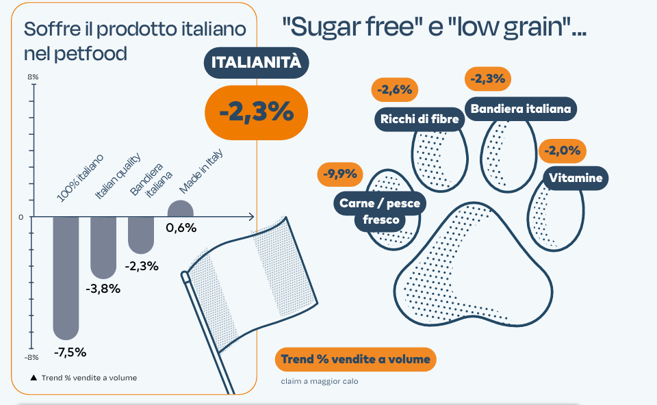 Sul fronte dell’italianità il richiamo in etichetta perde attrattività. I 521 prodotti che valorizzano l’origine italiana scendono del 2% a valore e del 2,3% a volume, con un giro d’affari sotto i 121 milioni di euro. In flessione anche i claim “100% italiano” e “Italian quality”, mentre tiene solo “prodotto in Italia/made in Italy”, in lieve crescita sia a valore sia a volume e con oltre 86 milioni di euro di fatturato.