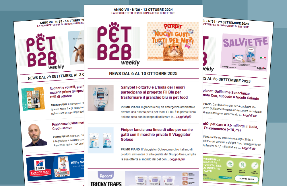 È disponibile il nuovo numero della newsletter Pet B2B Weekly del 13 settembre 2025, con le notizie dal mercato pet degli ultimi giorni.