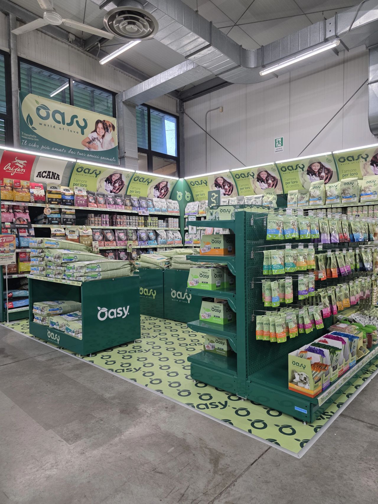 Il nuovo store-in-store ospita tutte le referenze del mondo Oasy, dal dry al wet, dalla linea Lifestage, che diventerà a breve Superior, alle linee Monoprotein e Grain Free in tutte le loro varianti. Il progetto abbraccia il mondo Oasy nella sua pienezza, offrendo esclusivamente pet food e snack all’interno del catalogo. Il corner, di circa 25 metri quadrati, è stato realizzato con l’obiettivo di creare un format moderno per il consumatore finale, valorizzando la gamma Oasy.